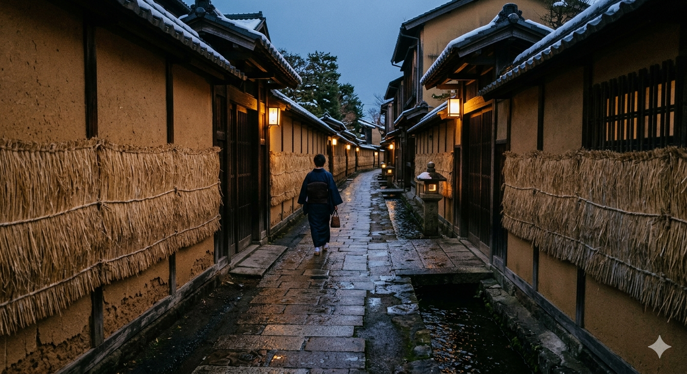 武家屋敷の細い路地を歩いていると、ふと足を止めたくなる瞬間があります。それは、冷たい空気の中でふんわりと漂う、家々から漏れる生活の灯りを見た時。