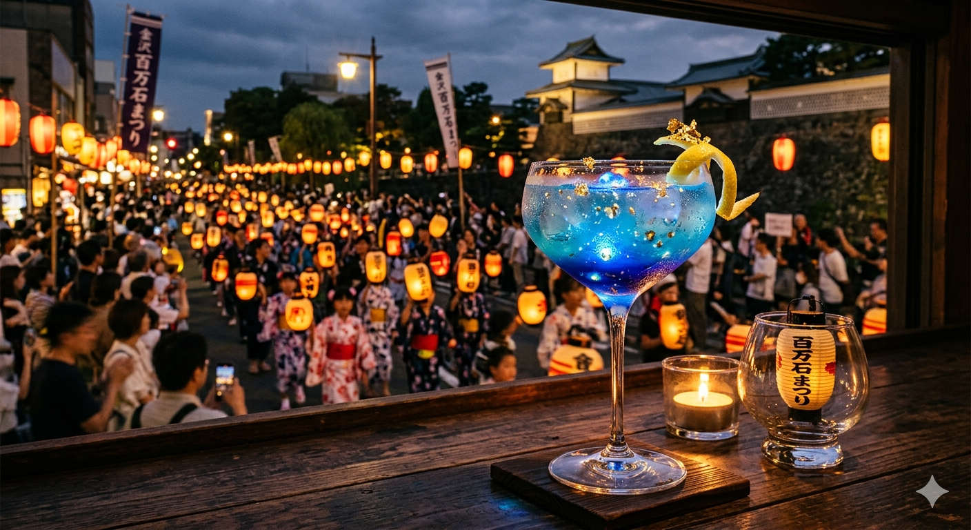 この一杯は、祭りの高揚感と、金沢を流れる犀川・浅野川の清涼感を一つに結びつけたものです。視覚的には、深い夜空へと変わる直前の「ブルーモーメント」を表現しました。